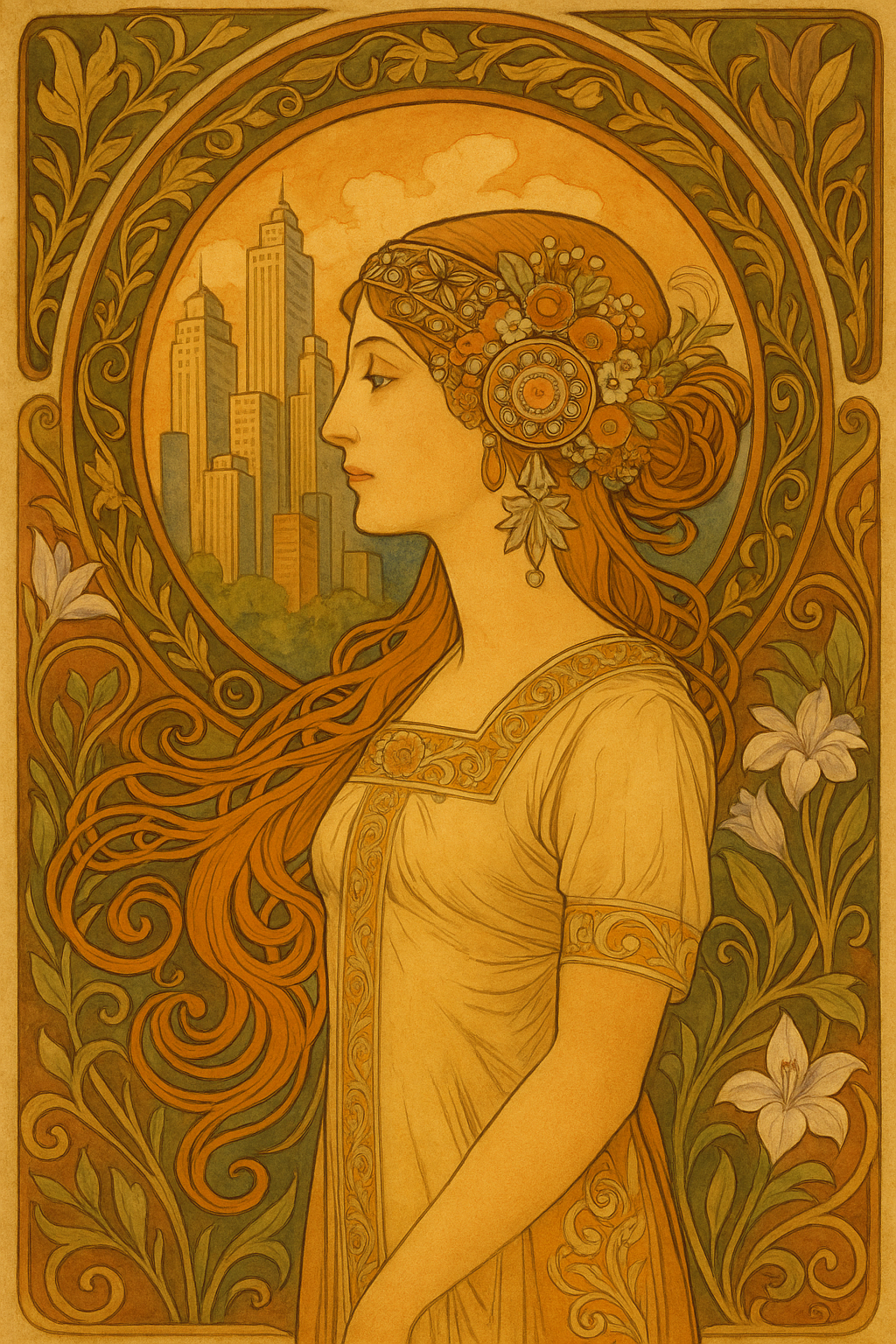 이 작품은 무하 특유의 장식적 아르누보 양식으로 8월 서울 상업·업무용 시장을 재해석했습니다. 꽃장식과 긴 머리칼의 흐름은 시장 회복의 지속성과 생명력을, 배경의 도시 스카이라인은 현대적 부동산 거래의 무대를 상징합니다. 은은한 황토·녹색 팔레트는 일시적 조정 속에서도 유지되는 긍정적 기조를 담아냈습니다. |
