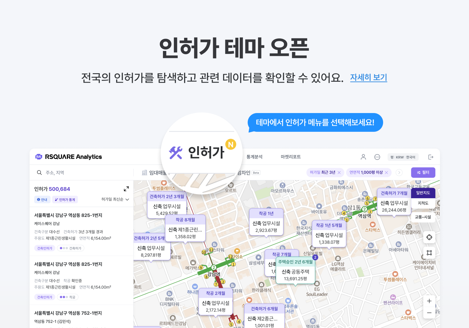 - 인허가 개요, 참여업체, 동별/층별 개요, 인허가 변동정보 - 시공사/설계사/감리사/건축주로 참여한 업체의 인허가 내역 및 인허가 통계 - 허가단계, 지역, 건축구분, 용도, 규모, 업체 등 다양한 관점과 필터 조건으로 인허가 통계 분석