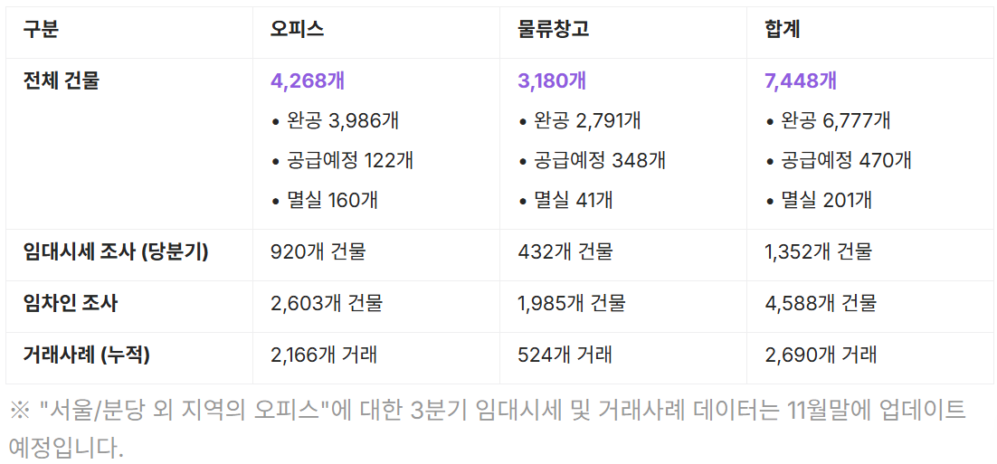 즉, 공장·창고 시장은 기저 수요가 유지되며 1조 원대 방어선은 유지했지만, 본격적인 회복 국면으로 보기보다는 보합세와 대형 거래 의존도가 혼재된 국면이라고 볼 수 있습니다.