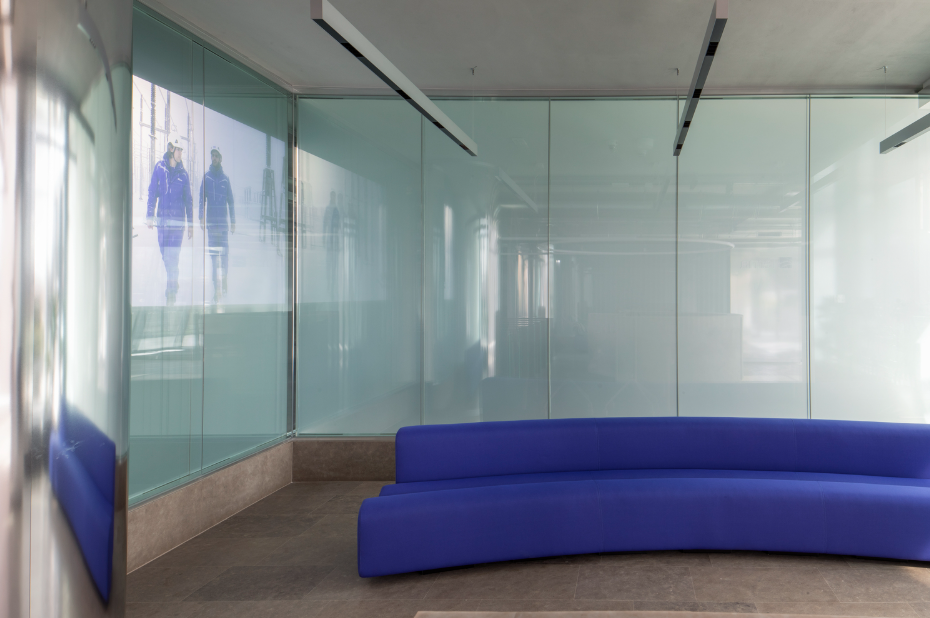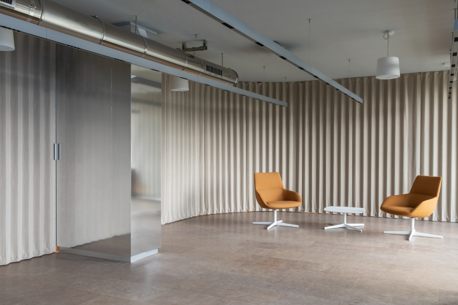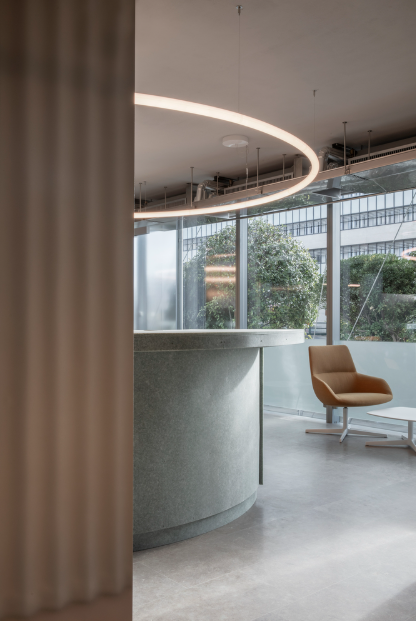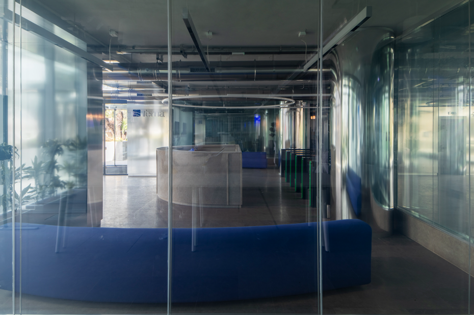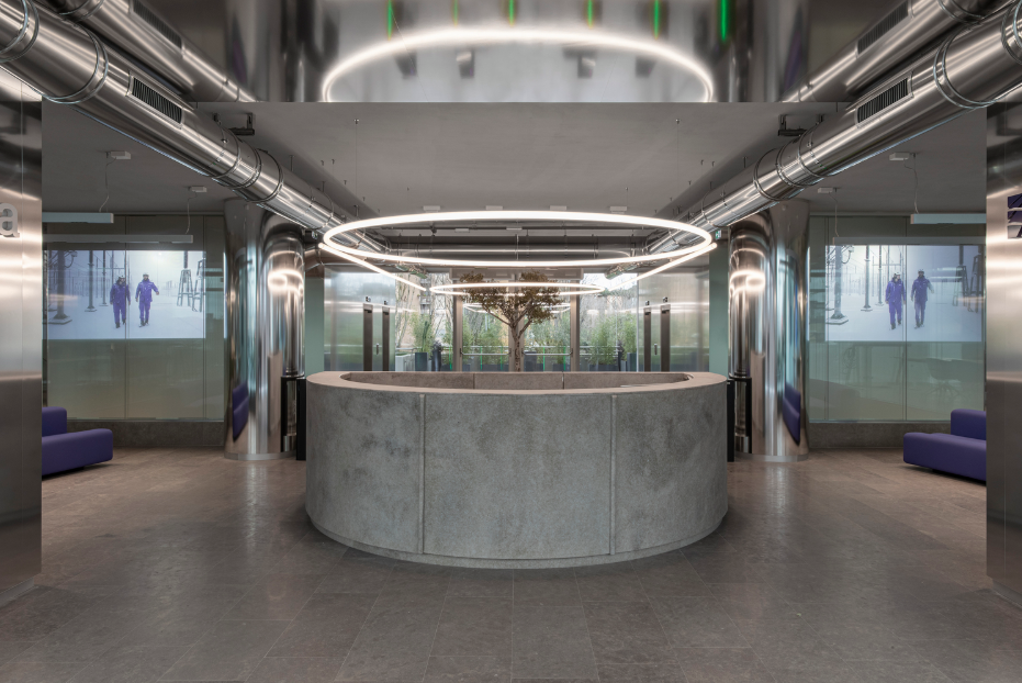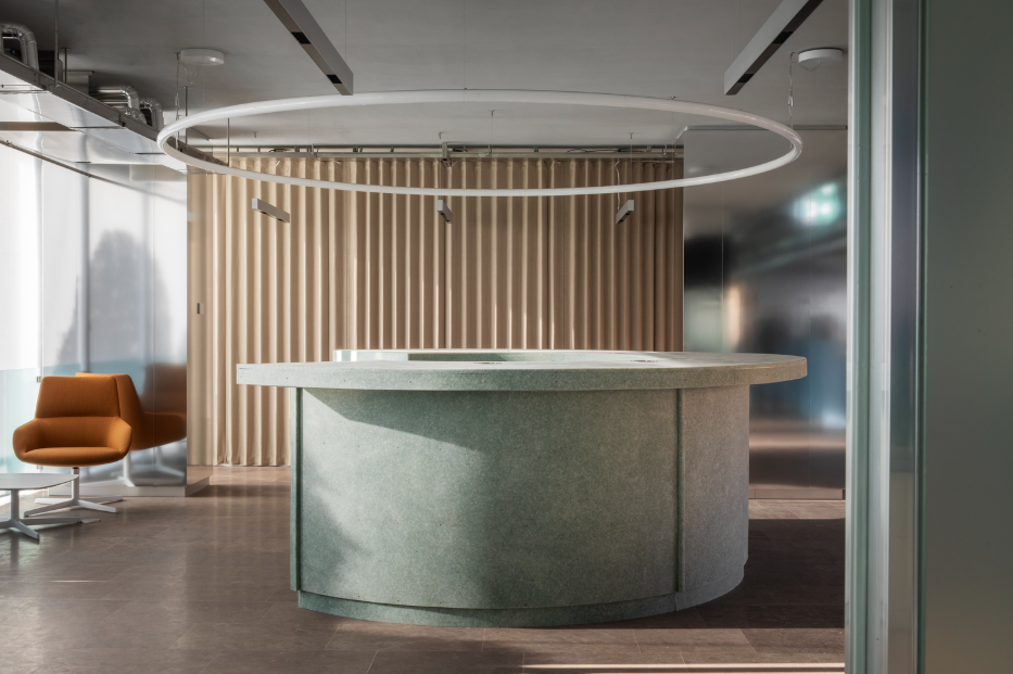 테르나는 리노베이션을 통해 중앙 리셉션 공간을 새롭게 배치했습니다. 부드러운 곡선 형태의 데스크는 주요 가구들과 마찬가지로 맞춤 설계했으며, eFM, IT’S, Plastiz가 협업해 재활용 및 재활용 가능한 플라스틱 패널로 제작했습니다.
