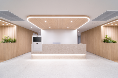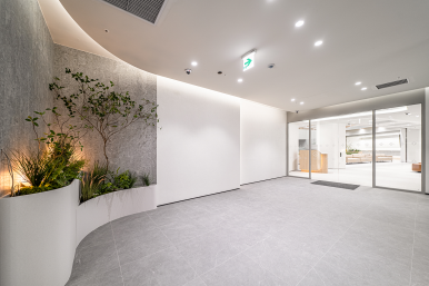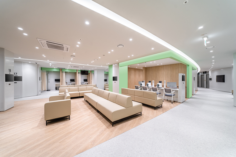 입구 한 편에 거친 질감의 석재 벽면과 은은한 간접 조명을 설치하고 식재 포인트를 활용해 진입부의 분위기를 부드럽게 환기시켰습니다. 입구를 지나 건강검진센터로 향하는 동선이 직관적이며, 방문객의 동선이 자연스럽게 이어집니다. |
