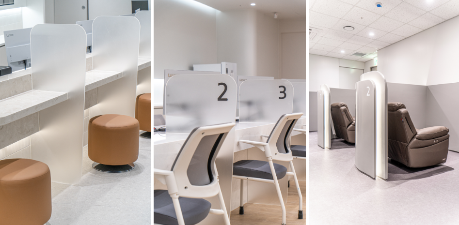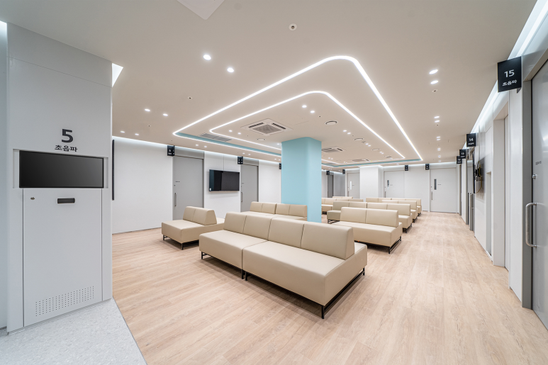 각 검진 영역에는 아이메드의 포인트 색상을 적용해 공간에 온기를 더했습니다. 건강검진센터 본연의 청결함을 유지하면서도, 차갑게 느껴질 수 있는 분위기를 포인트 컬러로 중화하여 방문객이 편안함을 느낄 수 있는 환경을 조성했습니다.