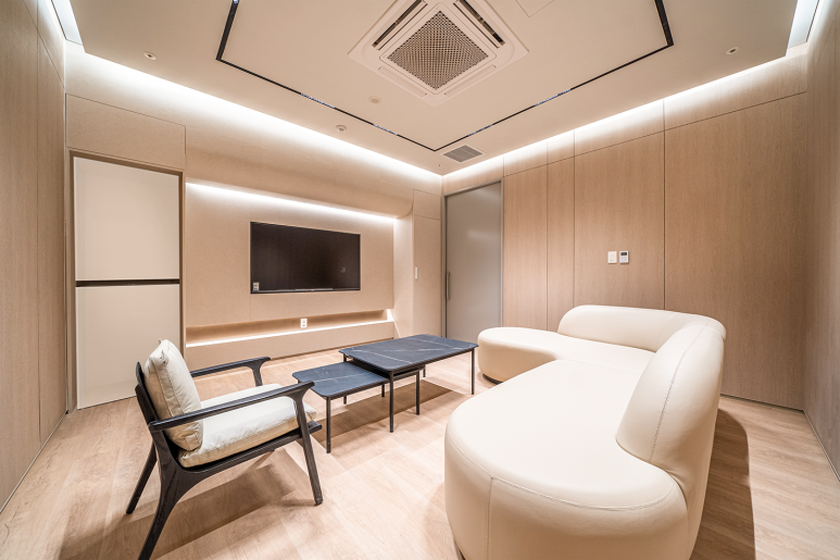 VIP 공간은 고객의 편안한 동선과 온전한 휴식을 고려해 계획했습니다. 베이지 톤 가구와 우드 소재의 조화가 아늑한 분위기를 형성하며, 검진 전후 충분한 회복 시간을 가질 수 있도록 프라이빗하고 차분한 공간으로 구현했습니다.