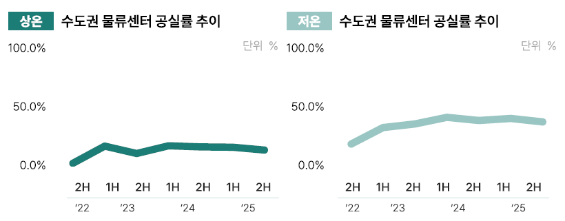 - 특히 저온은 평균 공실률이 37.3%로 여전히 높고, 일부 권역에서는 저온 면적을 상온으로 전환하는 사례도 관측됩니다. 권역별로는 60%대(서북권 62.1%)까지 관측돼 '공급 축소로 인한 숨 고르기'와 '구조적 리스크 해소'를 엄밀히 구분해야 합니다.