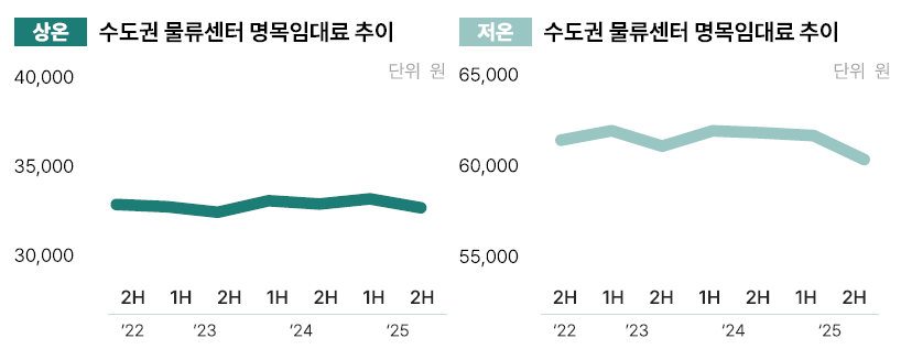 - 수도권 물류센터 명목 임대료는 상·저온 모두 소폭 하락했습니다. 시장 전체의 가격 하락이라기보다 경쟁력이 낮은 자산이 공실 해소를 위해 임대료를 크게 낮춘 영향이 큽니다.