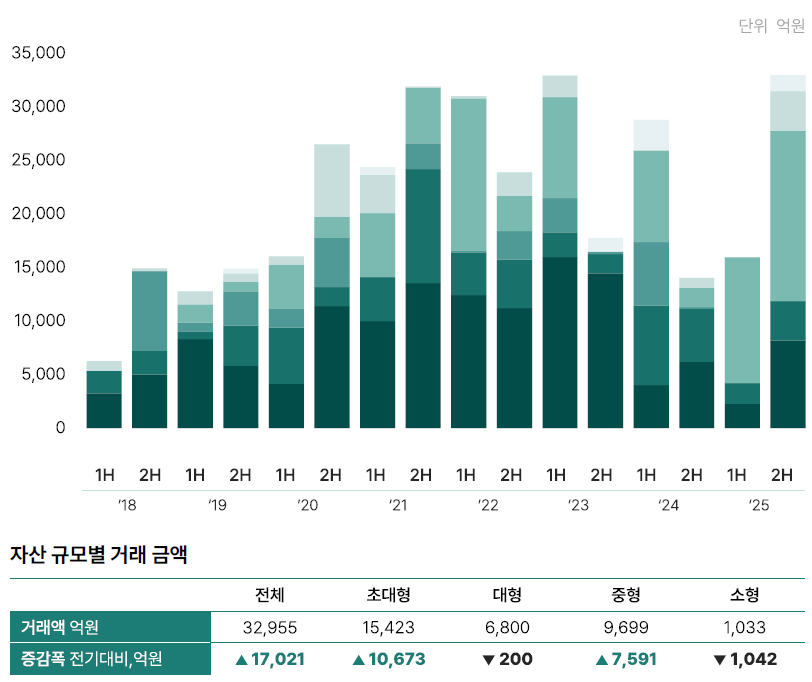 - 특히 초대형 거래만 1.54조 원(+1.07조) 증가하며 전체 거래 증가분 대부분을 설명합니다. 반면 소형 자산 거래는 오히려 감소했고, 대형 자산 역시 정체 상태를 보였습니다. 이는 투자자들이 모든 자산에 대해 공격적으로 매수에 나선 것이 아니라, 입지·임차 안정성·규모 측면에서 검증된 코어 자산에 자본이 집중된 결과로 해석됩니다.